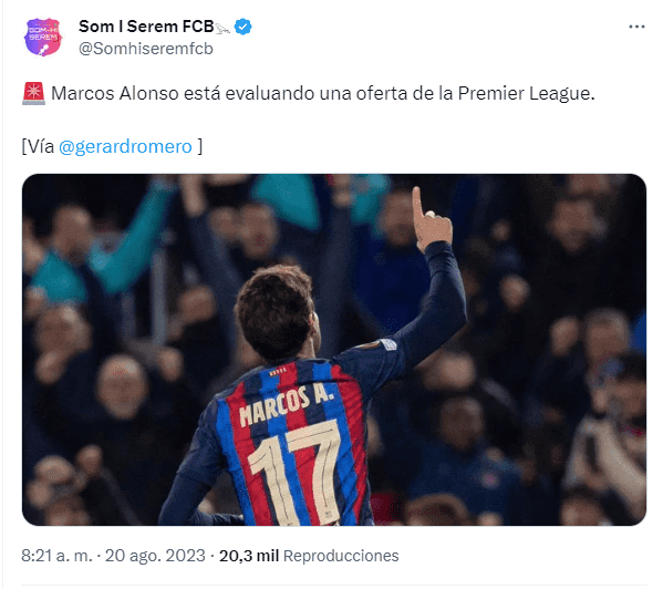 De acuerdo a la información del periodista Gerard Romero, Marcos Alonso lo descarta salir al aceptar una oferta de un equipo de la Premier League. La demoradas decisiones de los directivos de FC Barcelona por inscribirlo para poder jugar más el ninguneo que tuvo Xavi Hernández parecen haberlo cansado