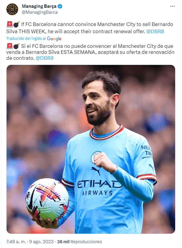 De acuerdo a la información del periodista David Reverter de diario Sport, Bernado Silva se cansó de tantas idas y vueltas y le puso un plazo definitivo a FC Barcelona para que intente convencer con la propuesta final al Manchester City. Sino lo dejen salir esta misma semana, el mediocentro se centrará en su próxima campaña en su actual equipo.