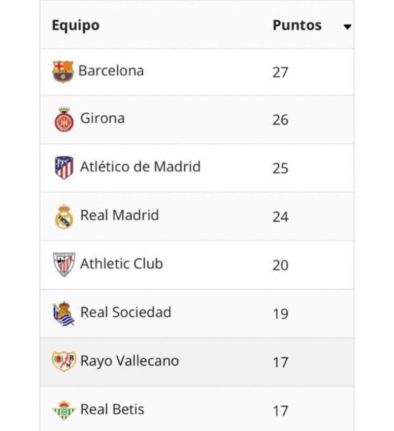 De acuerdo a información que apareció en las redes sociales del portal Archivo VAR, el FC Barcelona tendría que tener 27 puntos y ser líder en solitario en la tabla de posiciones de la liga española, por encima del Girona (26 puntos), Atlético de Madrid (25 puntos) y Real Madrid en cuarto lugar por 24 unidades, lejos de los dirigidos por Xavi Hernández.