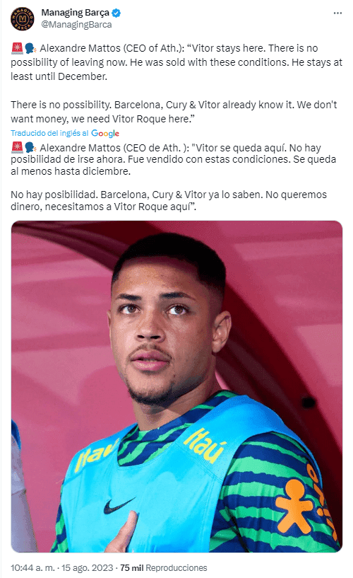 FC Barcelona tentó económicamente a Vitor Roque para que se sume ahora mismo y no en el mercado de pases de invierno, tal como estaba acordado, pero recibió una tajante respuesta por parte de Alexandre Mattos, CEO de Atlético Paranaense: “Vitor se queda aquí. No hay posibilidad de irse ahora. Fue vendido con estas condiciones. Se queda al menos hasta diciembre”.