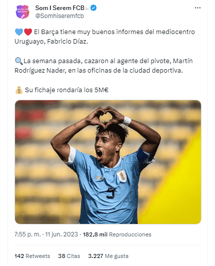 De acuerdo a la información de Som I Serem FCB, en FC Barcelona tienen apuntalado a Fabricio Díaz. El mediocentro, de apenas 20 años, acaba de tocar el cielo con las manos consagrándose con Uruguay tras vencer a Italia como el mejor del planeta en la edición ecuménica juvenil realizada esta año en Argentina.