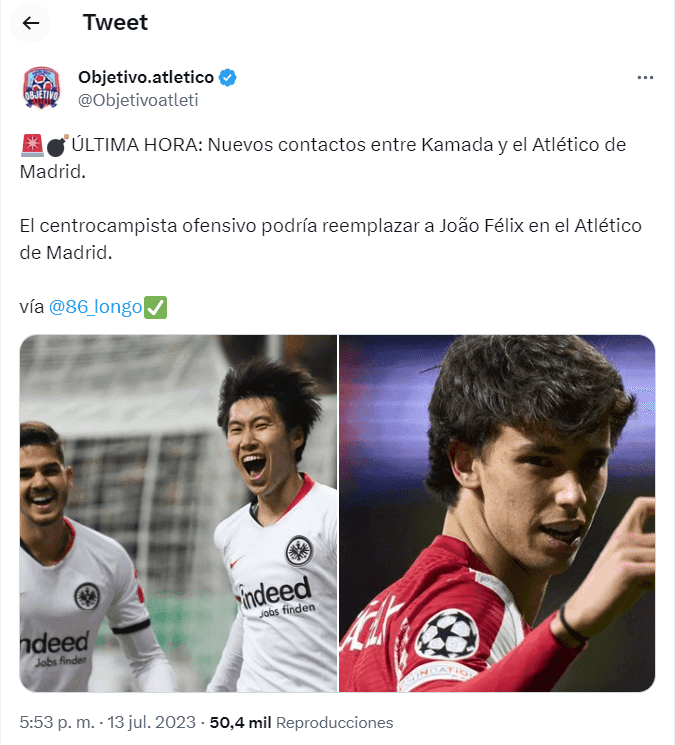 De acuerdo a la información de Daniele Longo, Atlético de Madrid va tras los pasos de Daichi Kamada, mediocentro ofensivo que tuvo un último paso por Eintracht Frankurt de la Bundesliga de Alemania. A Diego Simeone le gustan sus condiciones y ha dado el visto bueno para poder acelerar su fichaje.