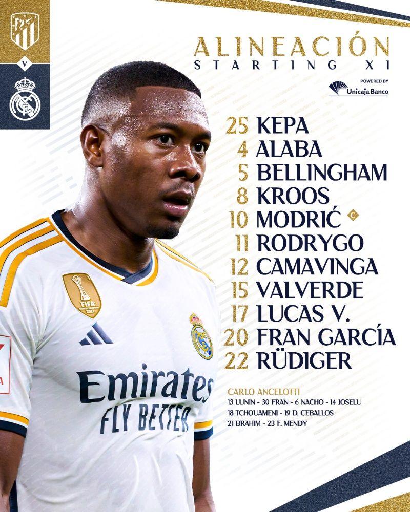 Once confirmado del Real Madrid (1-4-4-2): Kepa; Lucas Vázquez, Rüdiger, Alaba, Fran García; Camavinga, Fede Valverde, Kroos, Modric, Bellingham; Rodrygo. De esta manera Ancelotti apuesta por cinco mediocampista y Rodrygo como único punta, sin embargo, con el trajín del partido es probalbe que Bellingham o Valverde se desprendan y pasen al ataque ya que son los jugadorees con mayor capacidad de gol de ese mediocampo.