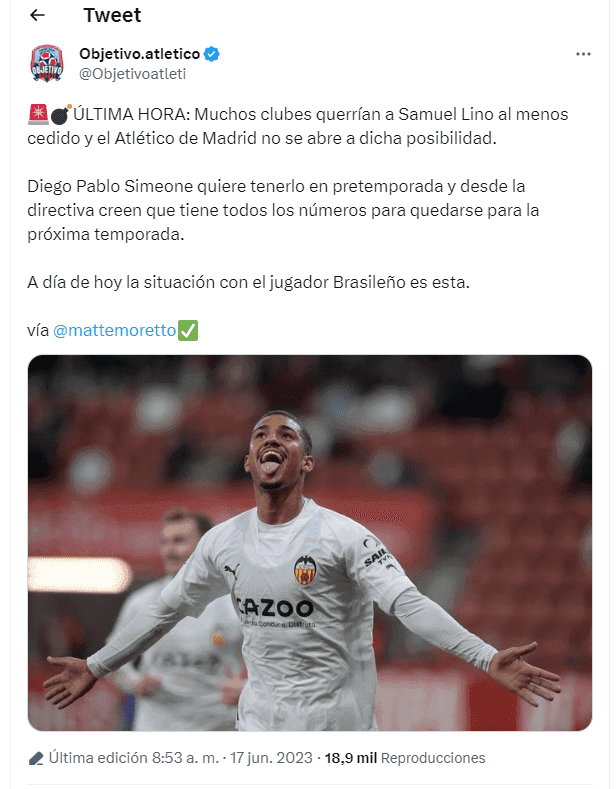 Ante este panorama, el elegido por Diego Simeone es Samuel Lino, de acuerdo a la información de Matteo Moretto de Relevo. El atacante de 23 años regresó tras su sesión en Valencia y el entrenador confía en él como una carta importante a la ofensiva para la próxima temporada. Con el equipo Che marcó ocho goles en la última campaña.