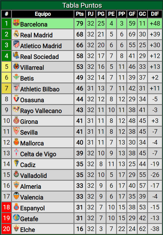 5° Villarreal (53), 6° Betis (49), 7° Athletic Bilbao (46), 8° Osasuna (44), 9° Rayo Vallecano (43), 10° Girona (41), 11° Sevilla (41), 12° Mallorca (40), 13° Celta de Vigo (39), 14° Cádiz (35), 15° Valladolid (35), 16° Almería (33), 17° Valencia (33), 18°, Espanyol (31), 19° Getafe (31) y 20° Elche (16). Aún restan disputarse el lunes 1 de mayo Mallorca vs Athletic Club y Sevilla vs Girona.
