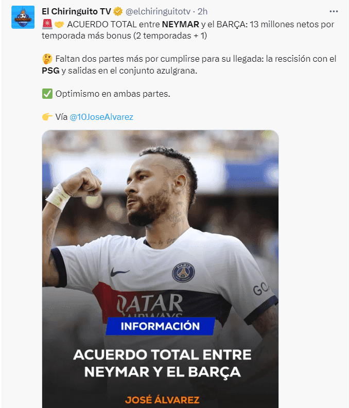 Esta situación ha generado contrariedad en el entorno del club francés, el cual deseaba tener a Neymar por esta temporada y así poder engranar un poco más el deseo de Luis Enrique de consolidar su proyecto en busca de Europa, quitando una pieza a Xavi y al Barça, pero todo ha generado una vuelta de hora, ambas instituciones estarían negociando la salida del brasilero para darle salto y salida a LaLiga nuevamente y esto depende mayoritariamente del jugador.