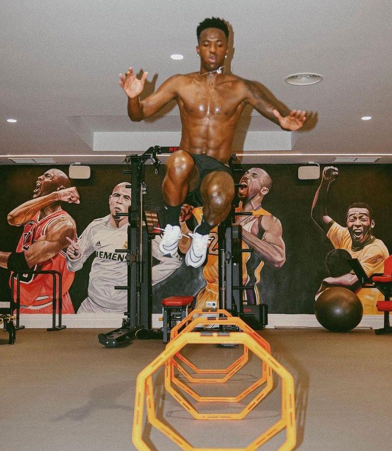 Los jugadores de fútbol de primera línea tienen la capacidad debido a sus ingresos económicos de poder poner en su casa lo que se les antoje. Mientras Cristiano Ronaldo cuenta con dos horas de arte que decoran su casa en Arabia Saudita y que cuestan unas verdaderas fortuna, Vinicius va por un lado mucho más económico y deportivo pintando en el gimnasio de su casa a figuras no solo del fútbol sino también del baloncesto. Mientras encaraba la parte final de su recuperación tras la lesión sufrida contra Celta de Vigo, Vinicius exhibió en sus redes sociales oficiales fotos entrenando en su gimnasio. De fondo se pudo ver en una de las paredes a los cinco deportistas de élite el delantero brasilero eligió para inmortalizar en su mural de su mansión.
