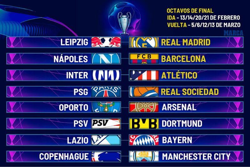 Más allá de los equipos españoles, el resto de los partidos de octavos de final de Champions League se jugará de la sigueinte manera: Arsenal frente a Porto, Dortmund ante PSV, Bayern Múnich contra Lazio y Manchester City enfrentará a Copenhague.