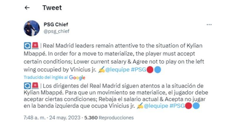 Según la información que brinda el medio L'equipe, Real Madrid sigue muy de cerca los movimientos de Kylian Mbappé pero la ofrecería un contrato menor al que percibe actualmente en Francia de 70 millones por año y además debería jugar en otro sector del ataque que no sea la banda izquierda que ocupa Vinicius.