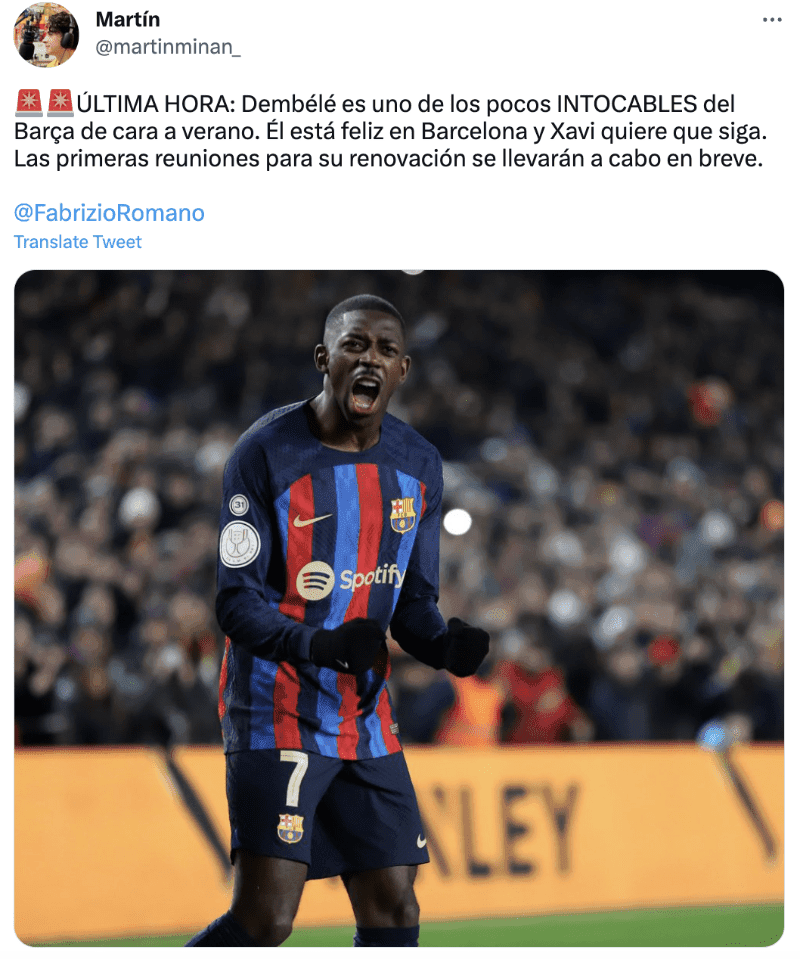 De acuerdo a información de Fabrizio Romano: “Dembélé es uno de los pocos INTOCABLES del Barça de cara a verano. Él está feliz en Barcelona y Xavi quiere que siga. Las primeras reuniones para su renovación se llevarán a cabo en breve”. De ese modo, el atacante francés no tiene luz verde para poder negociar.