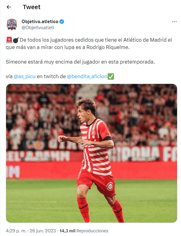 De acuerdo a la información que aporta el periodista Javier Díaz de AS, Diego Simeone monitorea el retorno de todos los jugadores cedidos en la pasada temporada y ya tiene a su elegido para poder pulirlo. Rodrigo Riquelme gusta mucho en el cuerpo técnico y será uno de los que tenga oportunidades en el próximo año.