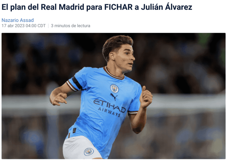Primero estuvo el FC Barcelona tras sus pasos, de acuerdo a información de Depor, sin embargo en las últimas horas también se puso como uno de los interesados el Real Madrid, para que pueda ser el tándem de Karim Benzema, que no tiene recambio como 9 en punta. Julián Álvarez tiene en su palmarés la Copa del Mundo en Qatar.