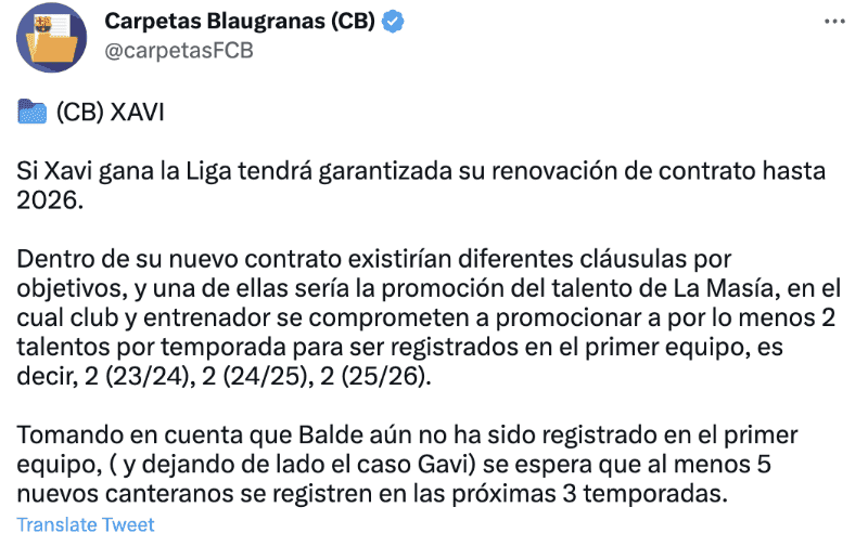 “Dentro de su nuevo contrato existirían diferentes cláusulas por objetivos, y una de ellas sería la promoción del talento de La Masía, en el cual club y entrenador se comprometen a promocionar a por lo menos 2 talentos por temporada para ser registrados en el primer equipo, es decir, 2 (23/24), 2 (24/25), 2 (25/26)”, destacó el medio.