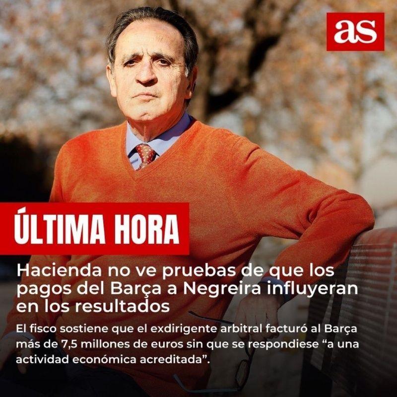 "Hacienda no ve pruebas de que los pagos del Barça a Negreira influyeran en los resultados. El fisco sostiene que el exdirigente arbitral facturó al Barça más de 7,5 millones de euros sin que se respondiese ‘a una actividad económica acreditada’", complementó el medio español antes mencionado sobre el caso al FC Barcelona.