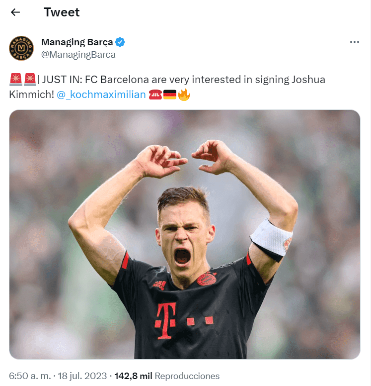 Según la información del periodista alemán Maximilian Koch, quién sigue el día a día de Bayern Múnich, FC Barcelona sigue bien de cerca los pasos de Joshua Kimmich, quién no vería con malos ojos dar el salto al gigante español en este mercado de pases. Para Xavi Hernández, sería un refuerzo de lujo.