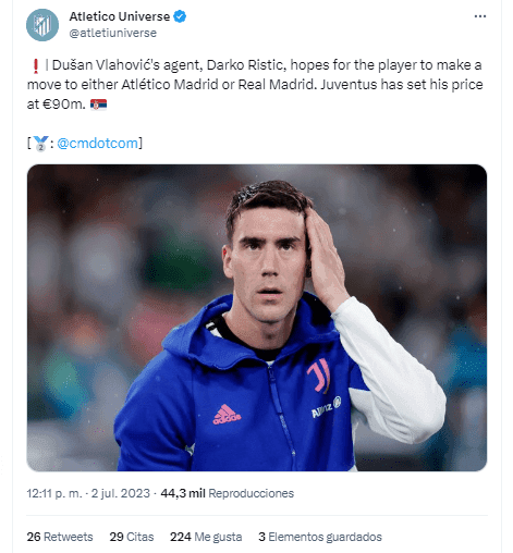 Desde hace varios meses, Atlético de Madrid quiere contar con el fichaje de Dusan Vlahovic. Sin embargo, las negociaciones con Juventus no han sido nada fáciles debido a su valor de 90 millones que tiene de mercado y ahora es Real Madrid el que lo apuntalas para suplir la baja de Karim Benzema.