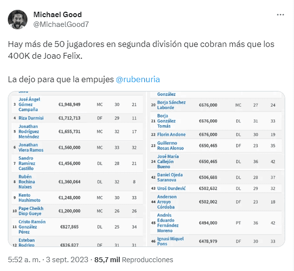De acuerdo al relevamiento de Michael Good, hay un total de 50 jugadores de segunda categoría de España que cobran más dinero por año que los 400 mil euros de Joao Félix en su nuevo arreglo con FC Barcelona. El que más cobra en la división de ascenso es Víctor Machín (gana 3,4 millones al año) y hay otros 48 jugadores hasta Rubén Duarte (gana 454 mil).