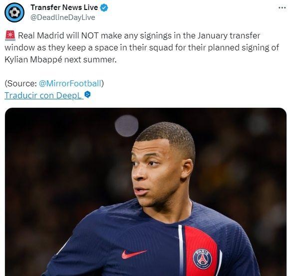 Real Madrid se ha puesto un objetivo claro, que es contratar a Kylian Mbappé, de acuerdo a información de Mirror Football que reveló: “El Real Madrid NO hará ningún fichaje en la ventana de transferencias de enero, ya que mantiene un espacio en su plantilla para su fichaje previsto de Kylian Mbappé el próximo verano”.