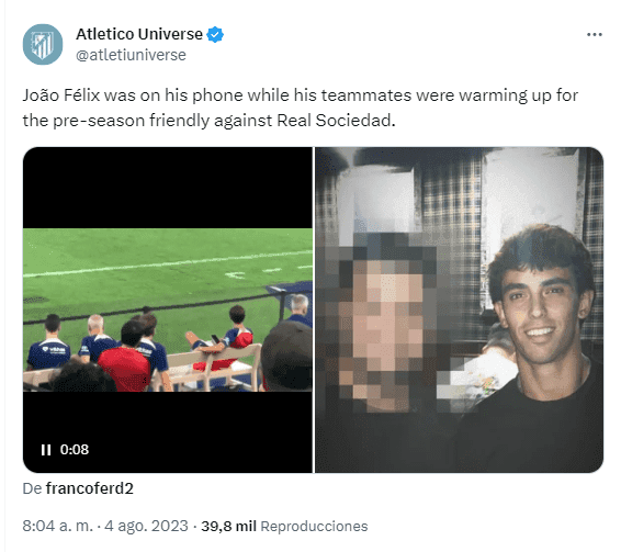 En las redes se volvió viral el video de Joao Félix con su teléfono mientras sus compañeros jugaban el amistoso ante Real Sociedad. Si bien es cierto que el luso no era parte de los convocados, claramente mostró poco interés en lo que estaban haciendo los demás integrantes del equipo en un partido formal.