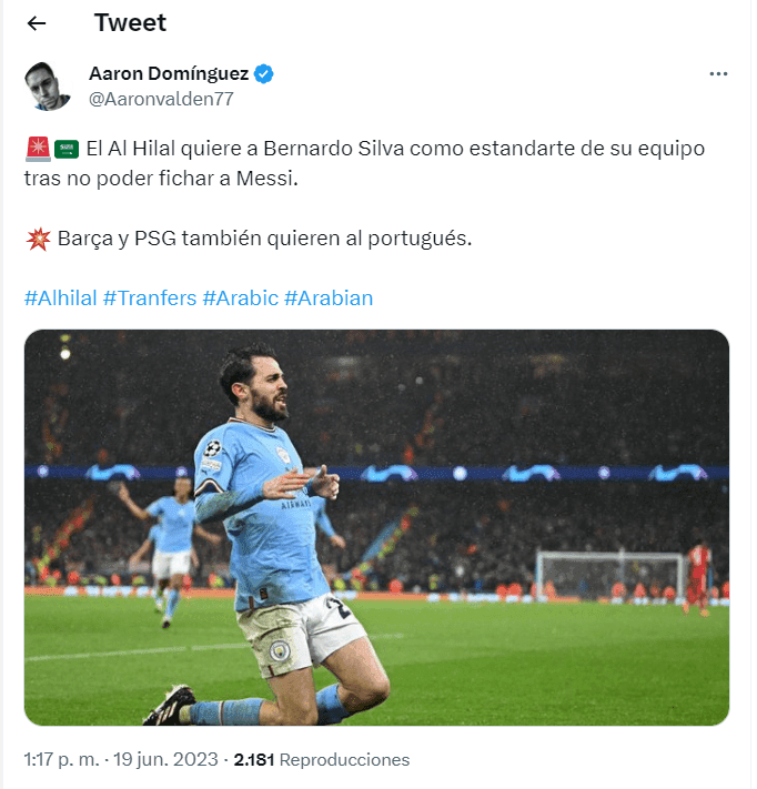 De acuerdo a la información que aporta el periodista Aaron Domínguez, el mediocentro portugués Bernardo Silva tiene una fuerte oferta de Arabia Saudita sobre la mesa que sería totalmente irresistible, no por lo deportivo sino más bien por la diferencia económica que significaría en su cuenta bancaria.