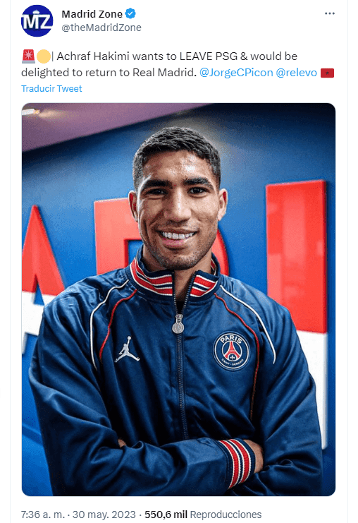 De acuerdo a la información del medio Relevo, el jugador nacido en Marruecos, Archraf Hakimi, busca salir de PSG para cambiar de aire y estaría encantado de volver a vestir los colores de Real Madrid, tras un paso sin pena ni gloria por el Merengue que apenas contabilizó un total de 17 partidos y dos goles.