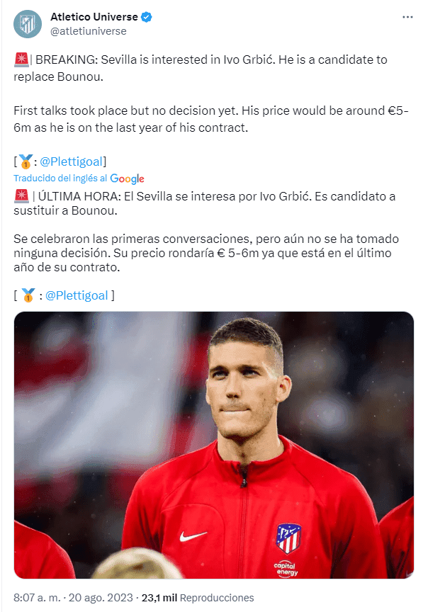 De acuerdo a la información de Florian Plettenberg, ya iniciaron las primeras conversaciones entre Sevilla, Atlético de Madrid y el propio Ivo Grbic. El valor del portero estaría cercano a los 5 o 6 millones de euros ya que es su último año de contrato con el club colchonero, y en caso de quedar libre, Atleti no recibiría nada por su pase.