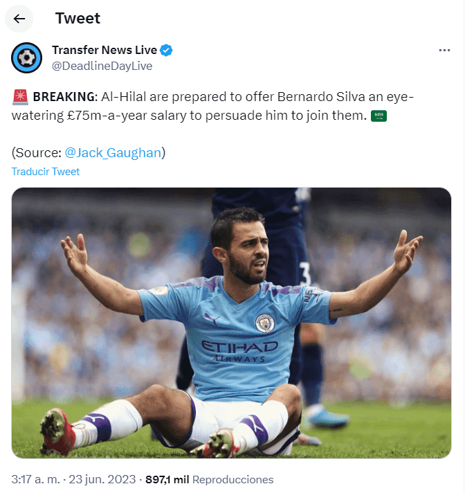 Bernardo Silva es una de las opciones que siempre tuvo en carpeta FC Barcelona para incorporar ene este mercado de pases. El tema es netamente vinculado a las cifras. Al Hilal FC le ofrece una verdadera fortuna de salario, poniendo sobre la mesa 75 millones de euros al año, superando los 9 que cobra actualmente el portugués en Inglaterra.
