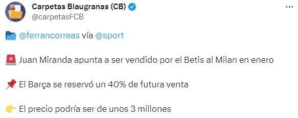 FC Barcelona sacó a varios jugadores de sus canteras que ahora están dando frutos, incluso en otros equipos como es el caso de Juan Miranda en el Real Betis. De acuerdo a información de Ferrán Correas de RAC1, lo están pensando en vender y esto le favorece al equipo que comanda Joan Laporta porque aún tiene derechos deportivos.