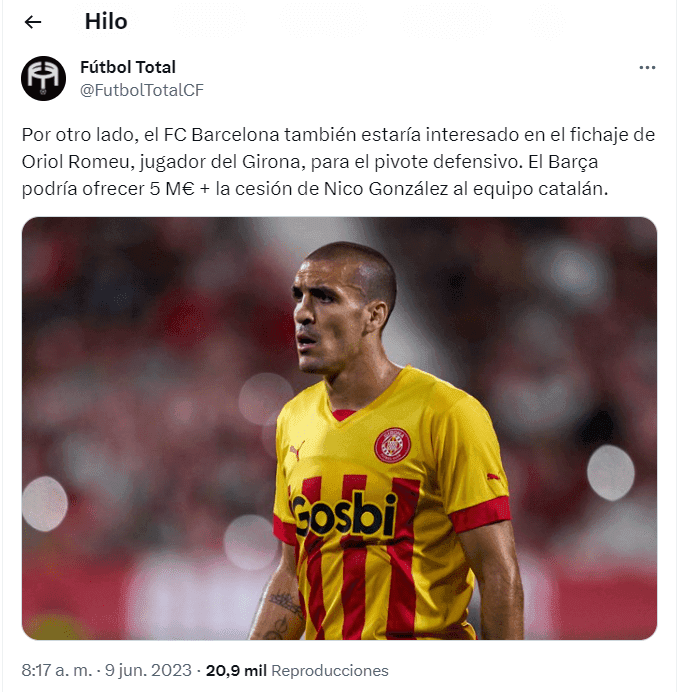 De acuerdo a la información de Fútbol Total, FC Barcelona sigue los pasos de Oriol Romeu, el volante central de Girona. Habiendo sonado los nombres de Joshua Kimmich de Bayern Múnich y Sofyan Amrabat de Fiorentina, que aparezca este jugador de 31 años como alternativa es de movida muy llamativo.