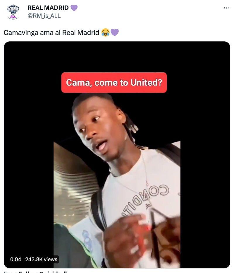 Camavinga no tiene pensado abandonar el Real Madrid al menos durante un largo tiempo. Con un contrato que le figura hasta junio del año 2027, Eduardo se encuentra muy cómodo con el Merengue. Justamente por eso se da la reacción cuando un fanático le dijo que si iría al Manchester United, cosa que es muy improbable que suceda.