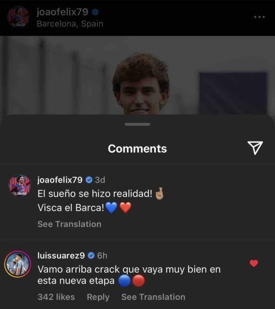 Ahora, después el auge de su llegada a la capital de Cataluña, el futbolista portugués recibió un comentario en el posteo de su presentación como nuevo jugador del Barcelona. El comentario fue de un goleador conocido por la afición Rojiblanca; nada menos y nada más que del goleador uruguayo Luis Suárez, quien al igual que João Félix, visitó las dos camisetas.