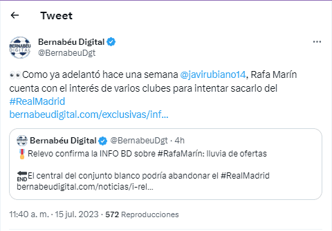 El tema ahora de cara a lo que viene en el corto plazo, es que Rafa Marín tiene varias opciones sobre la mesa, de acuerdo a Relevo. Al marcador central lo buscan del Real Betis, Celta de Vigo, Villarreal y el propio Atlético de Madrid. En alguno de esos elencos intentará lanzar su carrera en primera división.