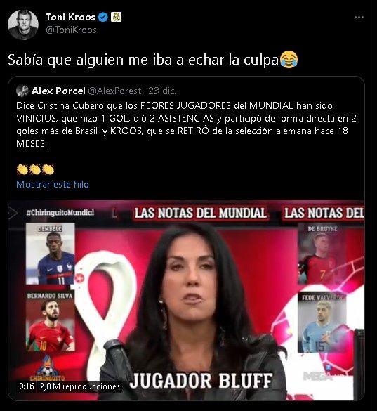 El video del error de Cristina Cubero se hizo tan viral que llegó al propio Toni Kroos. Lejos de quedarse callado, el centrocampista citó el tweet y escribió: “Sabía que alguien me iba a echar la culpa”. La frase la acompañó de un emoji de risa y su tweet en sí ya tiene 140.000 ‘me gusta’ y 14.000 retweets.
