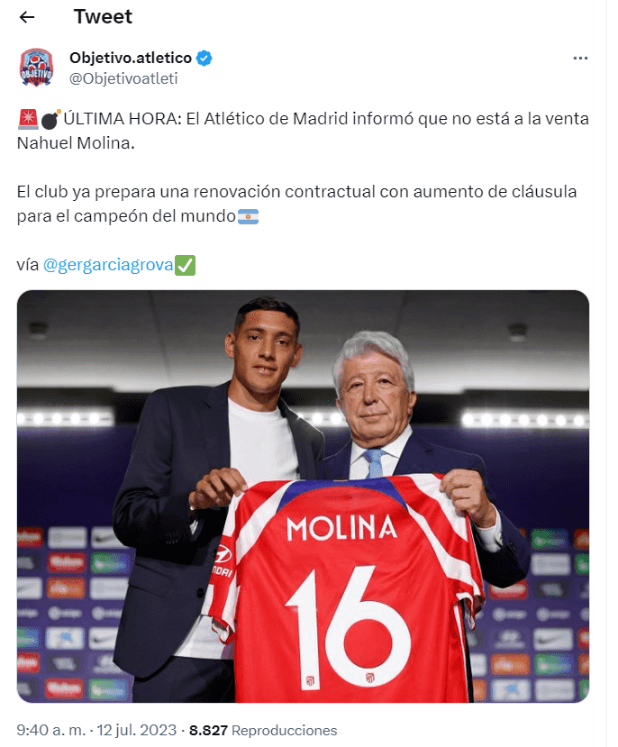 De acuerdo a la información de Germán García Grova, periodista de Tyc Sports, Nahuel Molina es intransferible en Atlético de Madrid y en el club preparan un jugoso nuevo contrato con tal de blindarlo. El objetivo es mejorarle el salario para ponerlo entre los mejores pagos del plantel y aumentar su clausula de salida.