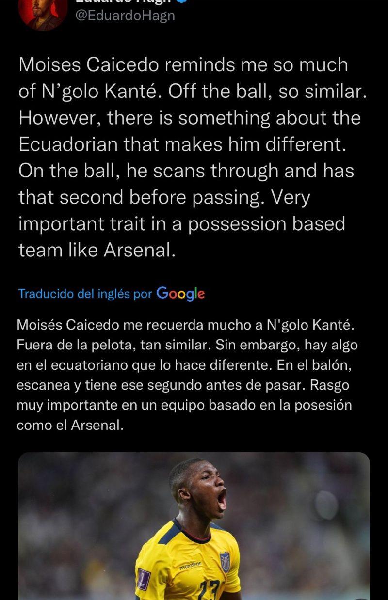 “Moisés Caicedo me recuerda mucho a N'golo Kanté. Fuera de la pelota, tan similar. Sin embargo, hay algo en el ecuatoriano que lo hace diferente. En el balón, escanea y tiene ese segundo antes de pasar. Rasgo muy importante en un equipo basado en la posesión como el Arsenal”, confesó el comunicador Eduardo Hagn.