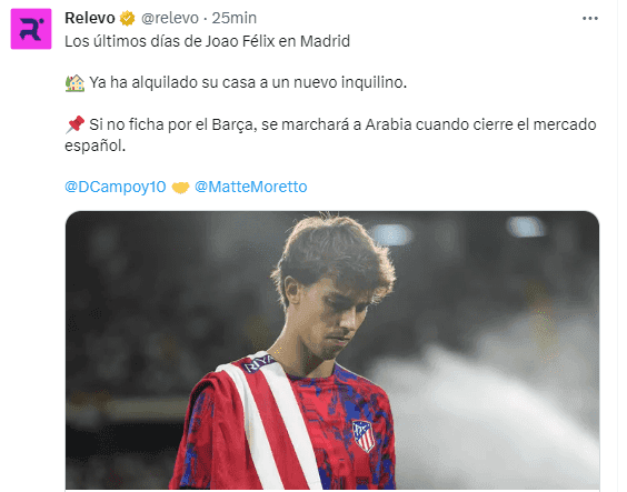 De acuerdo a información citada por el periodista Matteo Moretto, Félix ya habria puesto en alquiler su casa en Madrid a un nuevo inquilino, siendo una señal más que clara para su salida del Atleti, y mientras espera una oferta clave de estos tres escenarios posibles en las próximas horas. El portugués recoge elementos y alista maletas para prepararse hacia su nuevo hogar.