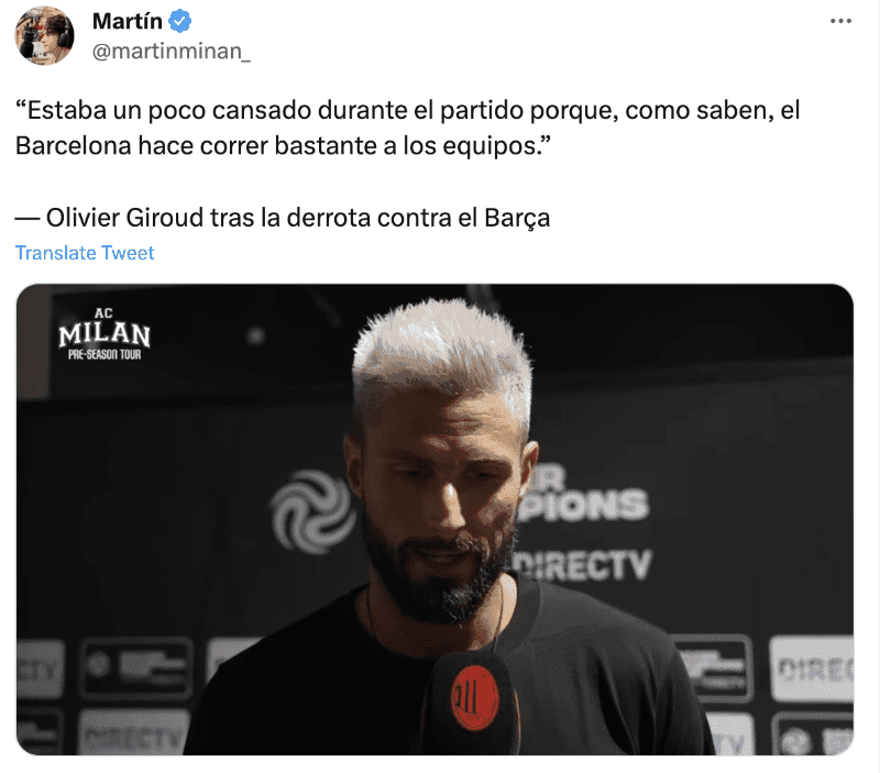 Olivier Giroud, delantero del AC Milán, acudió a la rueda de prensa donde dijo que se sintió cansado porque no pudieron tener la posesión del balón. “Estaba un poco cansado durante el partido porque, como saben, el Barcelona hace correr bastante a los equipos”, fueron las palabras del delantero francés.