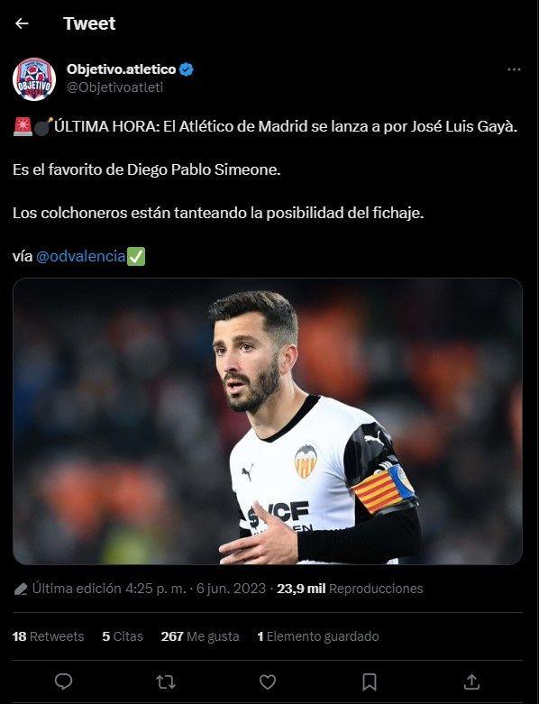 Se trata de una absoluta prioridad para el Cholo Simeone, estamos hablando de José Luis Gayà, actual jugador del Valencia en la primera división española que se desempeña como defensor. Tal y como mencionamos, es el objetivo principal del Atlético de Madrid para esta ventana, Simeone lo pidió especialmente.