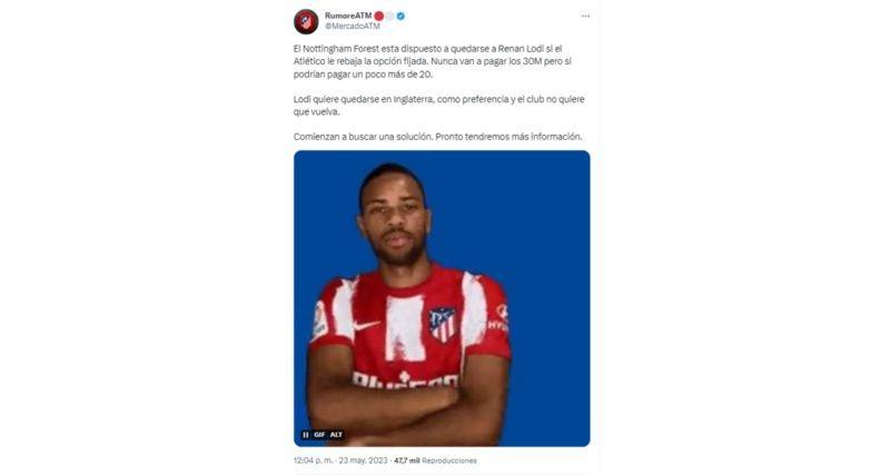 De acuerdo a la información de Rumore ATM, el brasilero Renan Lodi no va a retornar a Atlético de Madrid una vez que termine su cesión ya que el jugador prefiere quedarse en Inglaterra para seguir jugando en Nottingham Forest, sumado a que el cuerpo técnico rojiblanco tampoco cuenta con él para el próximo año.