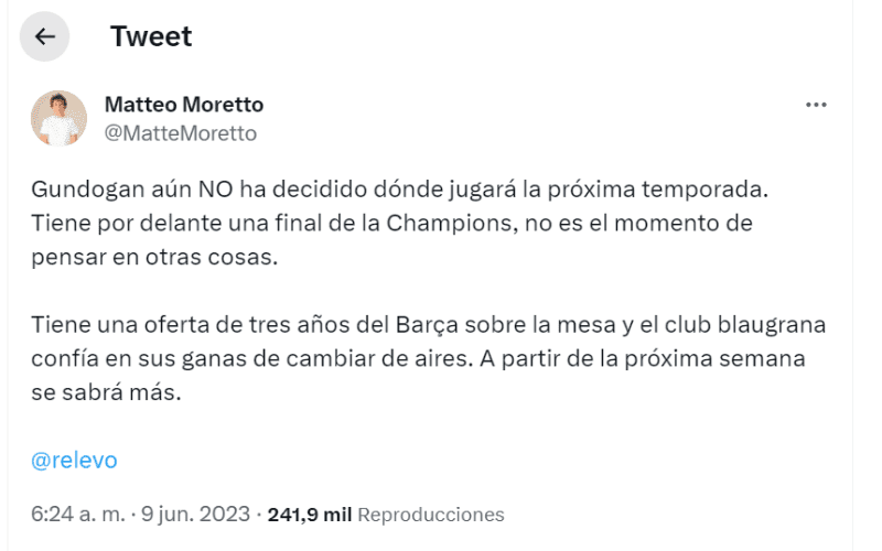 De acuerdo con información de Relevo, FC Barcelona deja sobre la mesa de Ikay Gundogan una oferta de tres años de duración para que sea un refuerzo del Culé. Esta situación podría desconcentrar al volante alemán, que juega un partido fundamental que es ni más ni menos que la gran final de la Champions League.