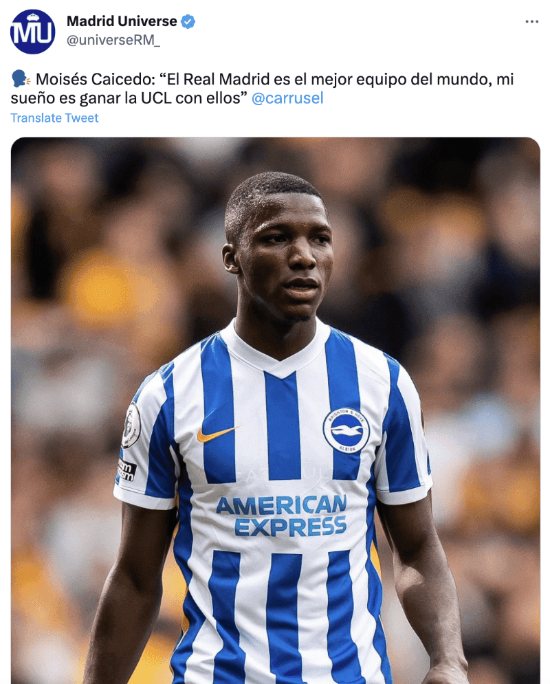 Real Madrid es considerado el equipo más grande del mundo para Moisés Caicedo, mediocentro ecuatoriano que actualmente está en Brighton de la Premier League. En entrevista con Carrusel Deportivo, dijo: “El Real Madrid es el mejor equipo del mundo, mi sueño es ganar la UEFA Champions League con ellos”.