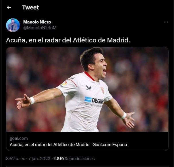 Hablamos de Marcos Acuña, lateral zurdo de gran despliegue que fue clave en la obtención del título mundial de Lionel Messi. Simeone lo ve con muy buenos ojos y ya le notificaron al Sevilla sus intenciones de ficharlo. Es común pensar que no será tan fácil arrebatarle a un club un jugador de estas características, sin embargo, según el periodista Manolo Nieto, desde el Pizjuán no tendrán problema en soltarlo siempre y cuando se realice una oferta acorde a la calidad del jugador.