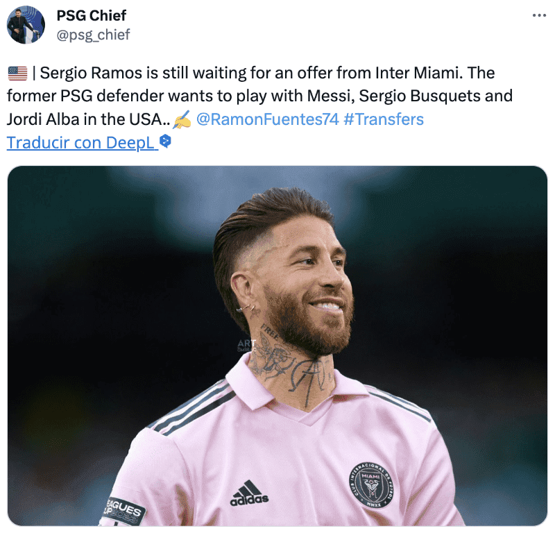 Sergio Ramos sigue sin equipo pero entrena por su cuenta, a la espera de seguir su carrera, pero no parece que será en Europa. De acuerdo a información de Ramón Fuentes: “Sergio Ramos sigue esperando una oferta del Inter de Miami. El ex defensa del PSG quiere jugar con Messi, Sergio Busquets y Jordi Alba en EEUU”.