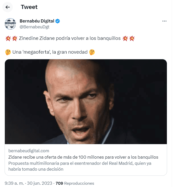 De acuerdo a la información que brinda diario OK, el Al-Ittihad, conjunto que recientemente fichó a Karim Benzema, le ofreció a Zinedine Zidane un contrato de 120 millones de euros por tres temporadas. Una oferta multimillonaria que, sin embargo, fue rechazada por el entrenador porque quiere tener una propuesta más importante en lo deportivo.