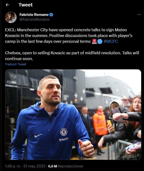 De acuerdo a la información del periodista Fabrizio Romano, Manchester City está interesado en Mateo Kovacic del Chelsea y ya abierto conversaciones concretas para poder ficharlo en el verano. Chelsea está abierto a venderlo y la idea es volver a conversar en el corto plazo. La oferta sería de 40 millones de euros.