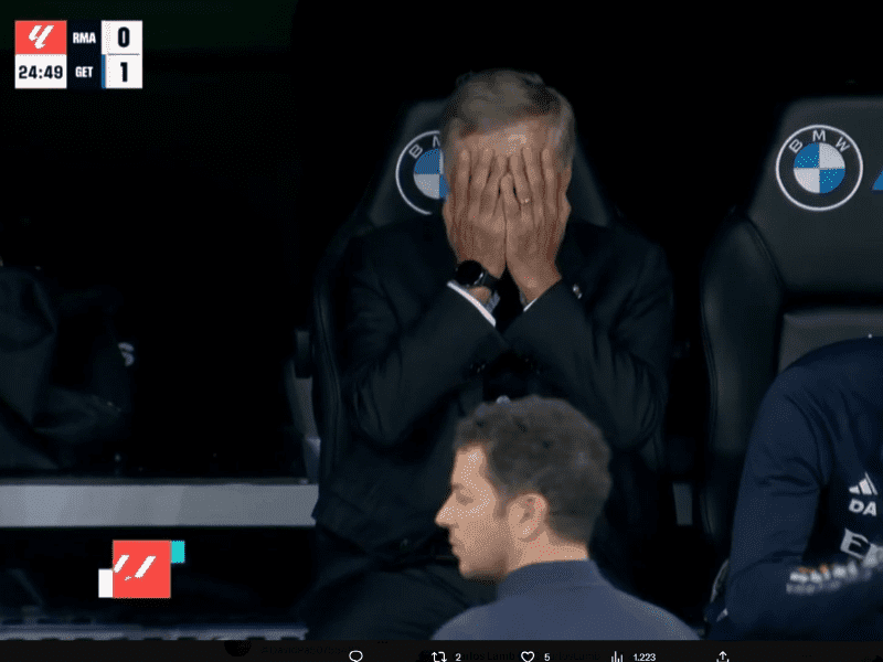 La polémica siguió y los reclamos airados de la visita no se hicieron esperar, tras la sucesión de la jugada y el llamado del comité de la cabina del VAR, Melero López reverso la decisión y el juego mantuvo su trámite, lo cual generó ira en el banquillo blanco y la reacción de Carlo Ancelotti quien no podía creer lo acontecido tras la jugada.