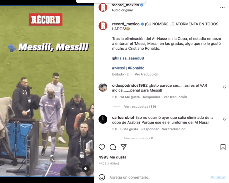 El medio Récord de México subió a sus redes sociales un video aficionado donde recoge las reacciones de Cristiano Ronaldo y se nota claramente su molestia porque además de perder el partido con el Al-Nassr, también le corearon el nombre de Messi. Luiz Gustavo, mediocentro brasileño, incluso tuvo que acercarse al Bicho para darle apoyo.