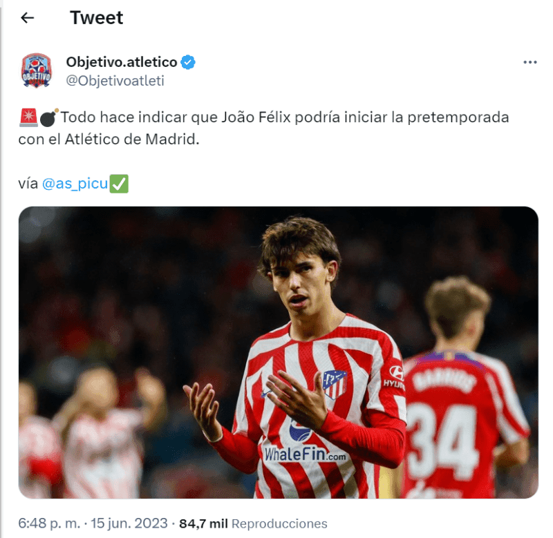 De acuerdo a la información que aporta Javier Díaz de diario AS, Joao Félix empezaría la pretemporada con Atlético de Madrid, club que sigue siendo el dueño de su pase y que no logra ningún pretendiente que se haga de sus servicios. Tras su paso bochornoso por Chelsea de Inglaterra, su reputación bajó en picada.