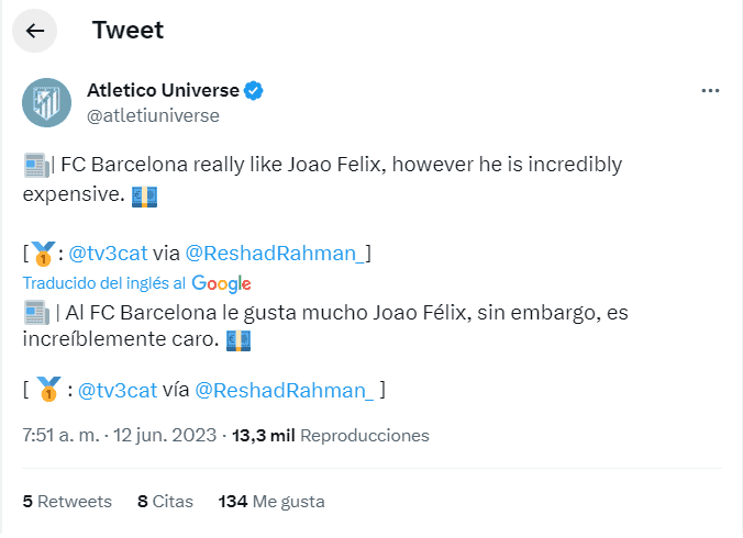 En Atlético de Madrid ya preparan el terreno y tienen una idea más que clara. Los directivos del Colchonero no dejarán ir al atacante portugués por menos de 100 millones de euros, cifra que en FC Barcelona consideran excesiva, de acuerdo a la información que maneja el periodista Reshad Rahman.