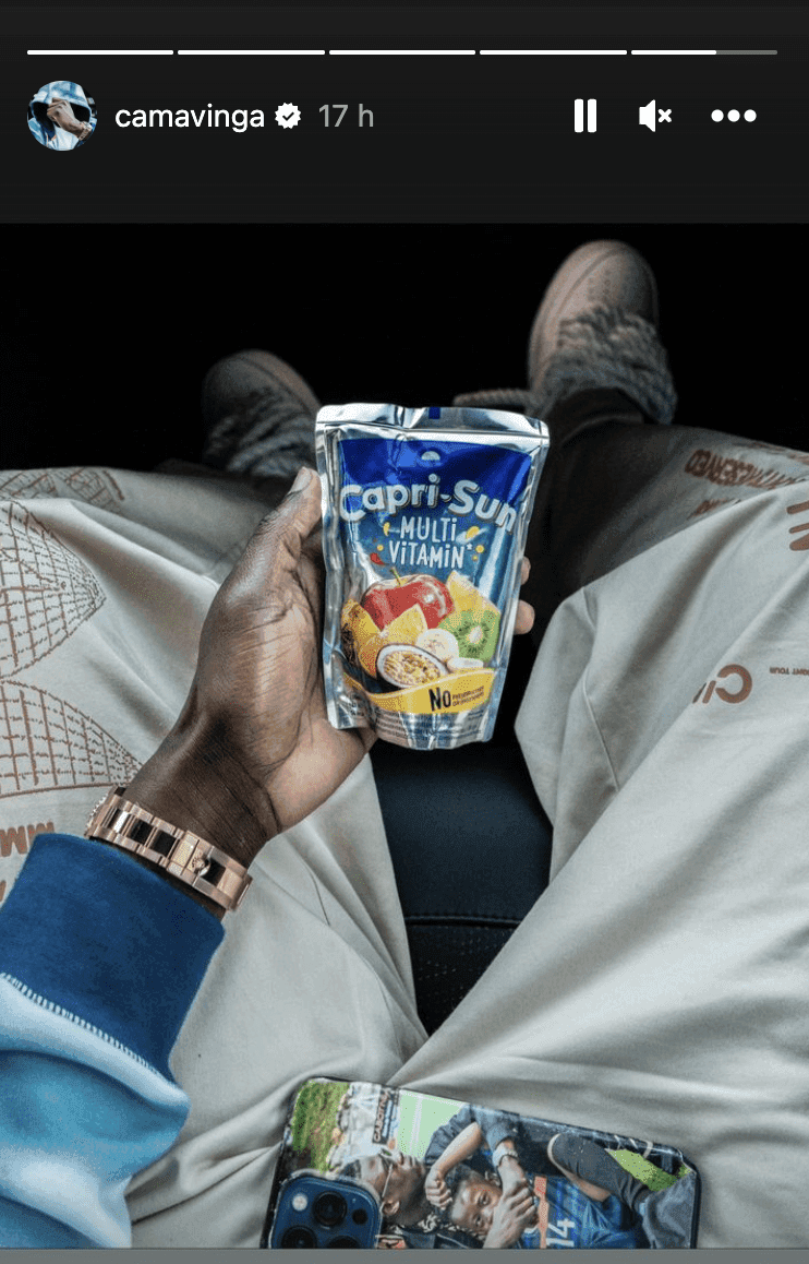 Eduardo Camavinga, en lugar de mejorar, apareció vendiendo una marca de jugos en sus redes sociales, lo que ha levantado el cuestionamiento de los hinchas en las redes sociales, pues consideran que debería estar centrado en entrenar y rendir en el campo de juego, pero en su lugar ha decidido patrocinar una marca por medio de las redes sociales.